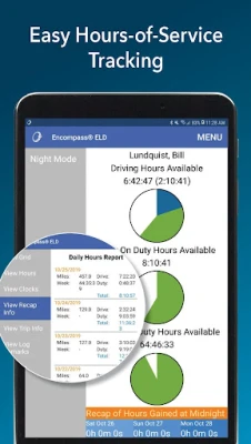 Hours-of-service and telematics data is captured from the engine via a hardline adapter from the engine’s diagnostic port into the ELD hardware. The hardware continuously records and stores engine data. Data is transmitted via Bluetooth from the hardware to the Encompass® ELD application on drivers’ Android™ devices. Hours-of-service data and alerts are presented to the drivers in real time using compliance rulesets determined by the company. Data from the Android™ device is transmitted via cellular connection to the Encompass® online back office for hours-of-service auditing, reporting and recordkeeping.